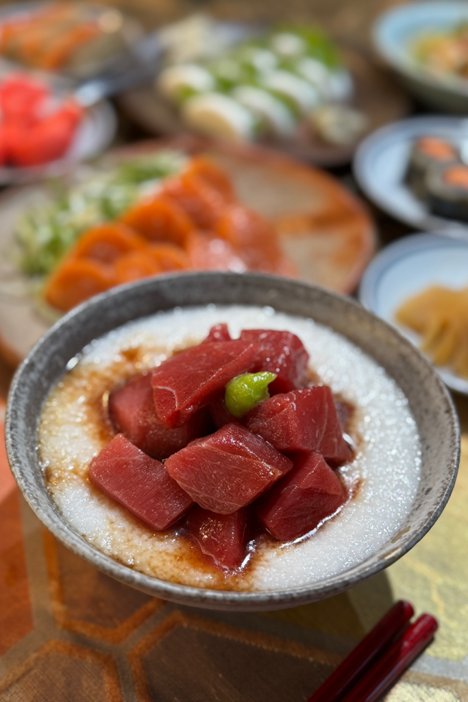 山口県から冷凍されないで飛行機で飛んできたかまぼこと、静岡のわさび漬け。ローカルのオーガニック紫蘇とアラスカのイクラ。みなさん、あちこちから大集合ありがとう!